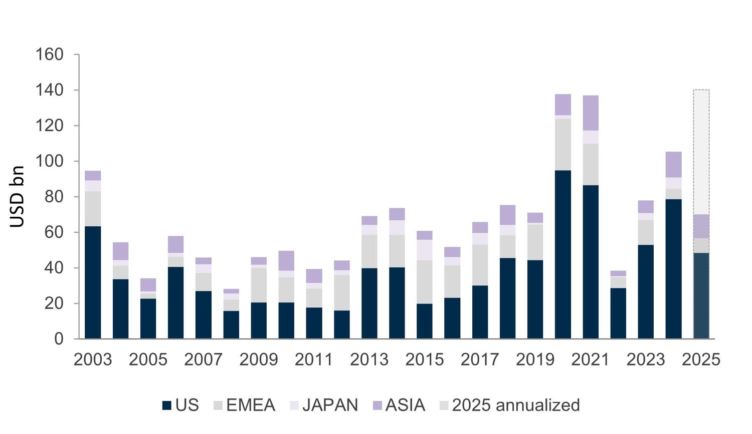 The primary market remains strong, with more than USD70bn issued YTD6, tracking ahead of 2024’s pace and edging closer to the records of 2020-2021. Conditions are still in favour of investors with an average coupon of 2.5% – twice the average of the record Covid years7.