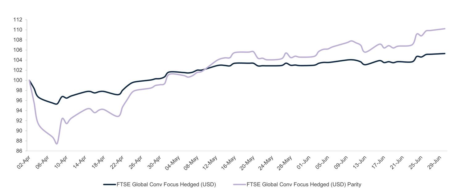 During the April sell-off, they demonstrated their defensive qualities by cushioning losses, and participated meaningfully in the subsequent rebound. From 2 April’s ‘Liberation Day’ to 30 June, global CBs captured 52% of the upside of their underlying equities (+5.29% vs. +10.22%)2, showcasing their renewed asymmetric behaviour.