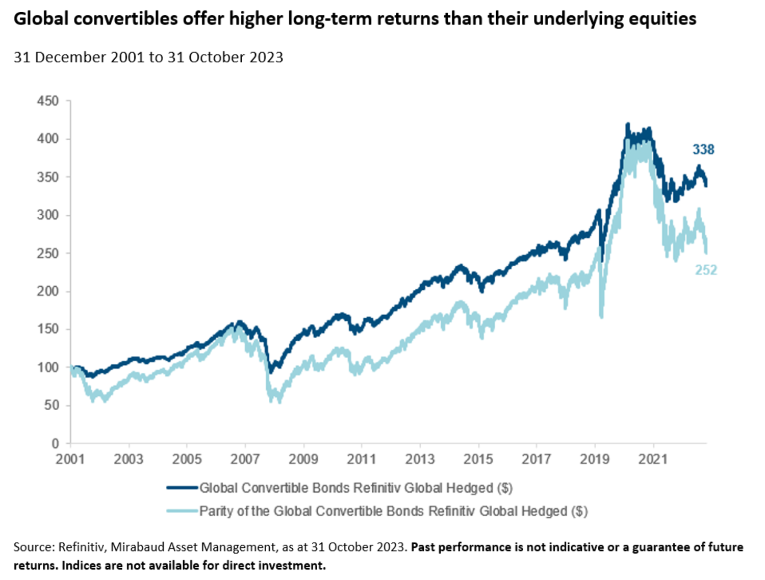 The hybrid structure cannot be replicated by combining equities and bonds because the convertible market has a make-up by sector and market capitalisation exposures that differ from global equity markets. Additionally, many convertible bond issuers have no existing straight debt, thus providing additional investor diversification.